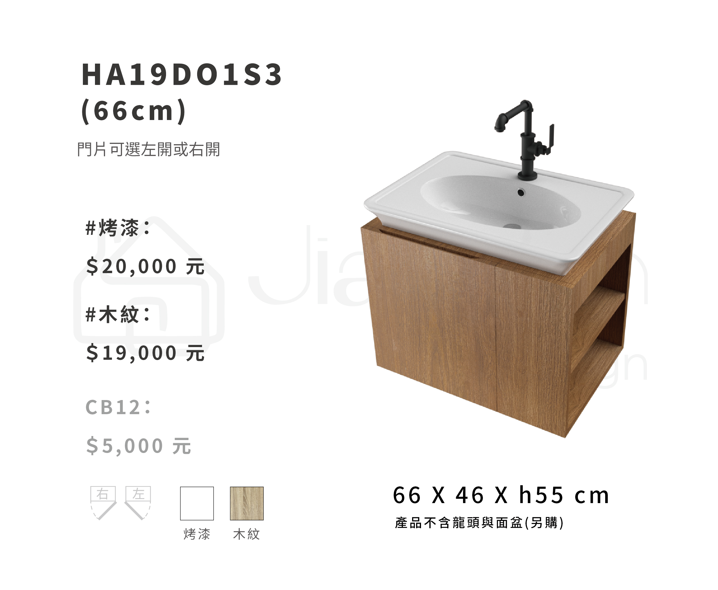 型 號:HA19DO1S3 產 品:精緻浴室櫃-防水發泡板 66cm -產品不含龍頭與面盆(另購) 尺 寸:66 X 46 X H55 cm (門片可選左開或右開) 烤漆:NT$ 20,000 木紋:NT$ 19,000 CB12:NT$ 5,000
