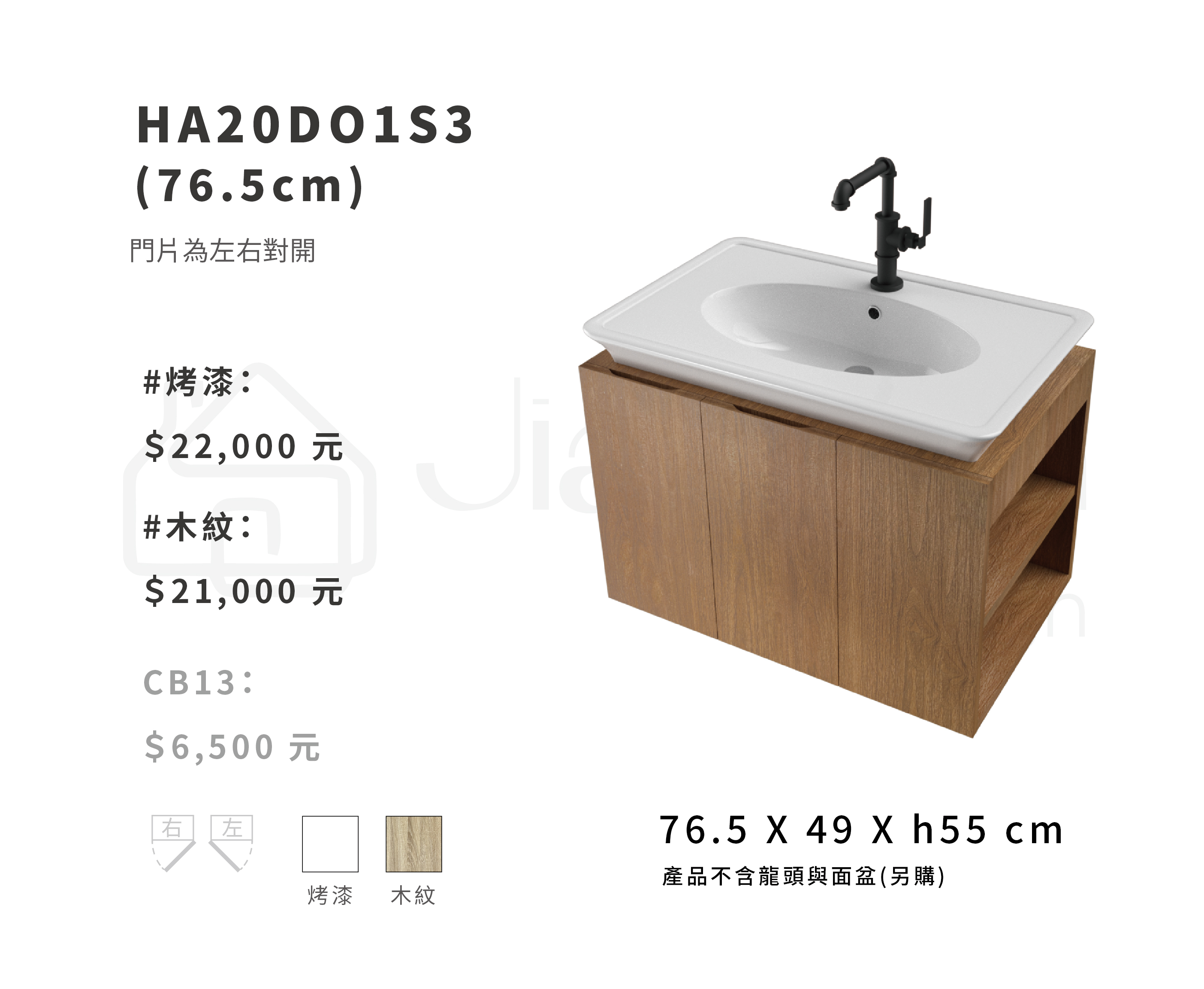 型 號:HA20DO1S3 產 品:精緻浴室櫃-防水發泡板 76.5cm -產品不含龍頭與面盆(另購) 尺 寸:76.5 X 49 X H55 cm (門片為左右對開) 烤漆:NT$ 22,000 木紋:NT$ 21,000 CB13:NT$ 6,500